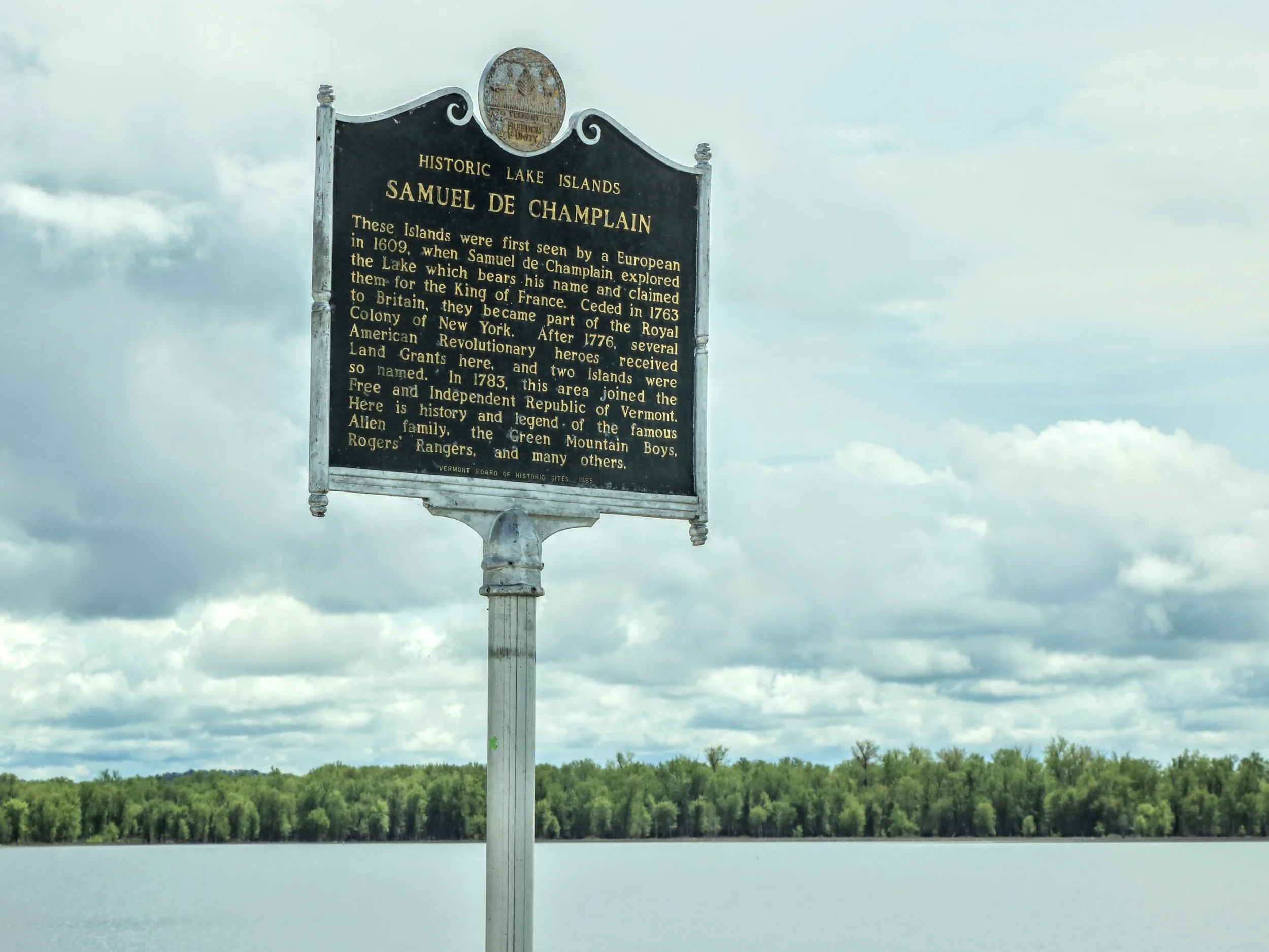 This sign on the shores of Lake Champlain delivers an unabashedly Eurocentric history of the area. Samuel de Champlain explored and mapped what is now Southeastern Canada and the northeastern U.S. on behalf of France. His initial goal was to find the elusive Northwest Passage to Asia and, along the way, establish fur trade with indigenous people. Failing the first goal, he made alliances with and lived among the Wendat (Huron) and Anishinabe (Algonquin) people (in his diary, he referred to them as “savages”). The Wendat and Algonquin persuaded them to assist them in a campaign against the Oneida and Onandaga, and later the Haudenosaunee (Iroquois) people, in their competition for fur trade with the French. Champlain’s role in a Wendat/Anishinabe victory against the Haudenosaunee did indeed increase First Nation’s fur trade with the French.